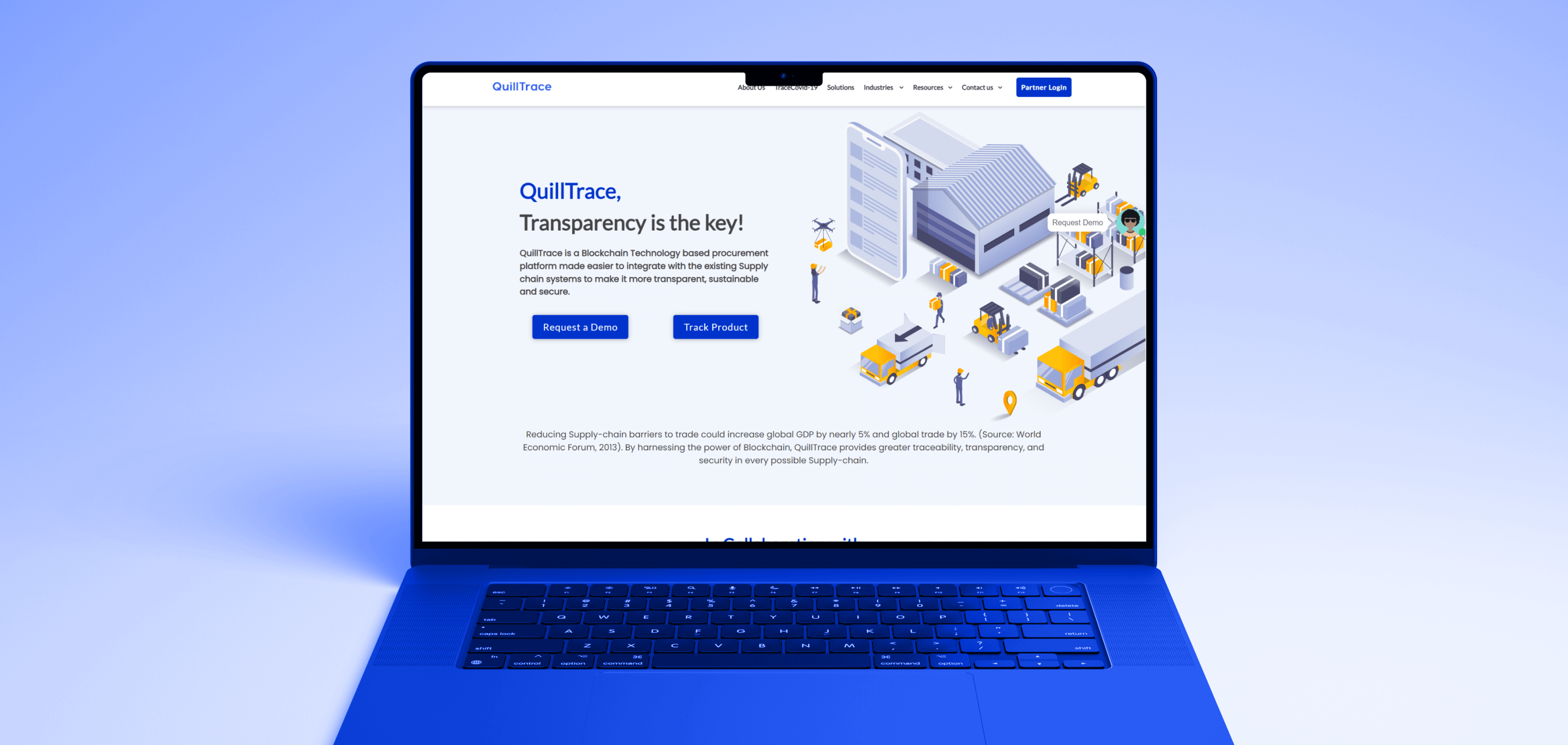Quilltrace brings transparency and decentralization to global supply chains using blockchain technology. I developed the website with a data-driven architecture, that blends enterprise-grade clarity with futuristic aesthetics, node-inspired graphics, and smooth transitions. The development process emphasized security, responsiveness, and scalability, ensuring a flawless experience for clients exploring blockchain-powered supply chain solutions.